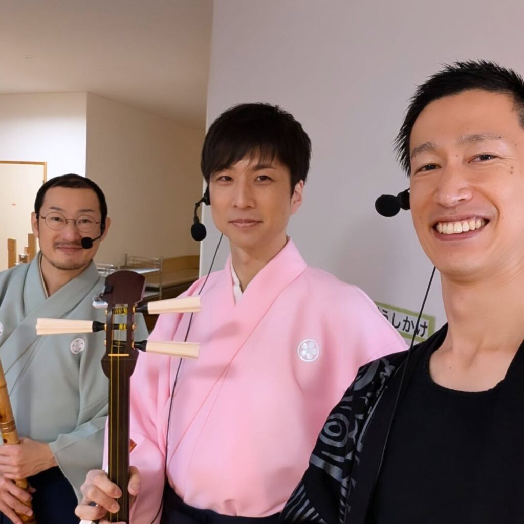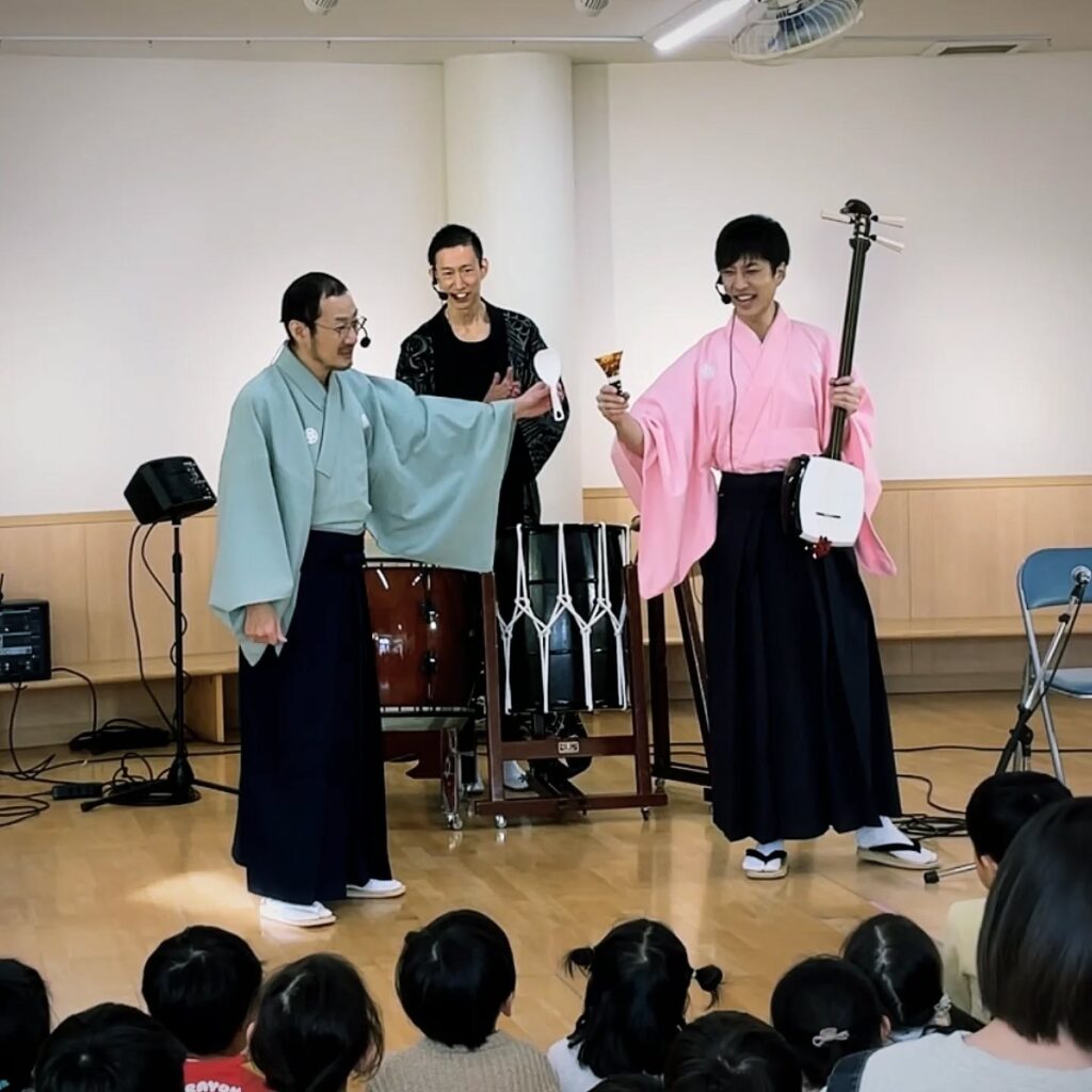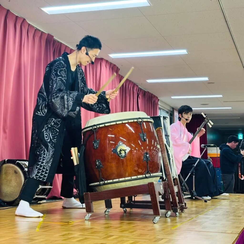 代表の湯浅大吾さんから三味線担当を弾き継ぎ間もなく一年、尺八松本宏平さん、和太鼓シンゴさんとのグループ感も更に良い感じになって一層子供達も盛り上がってくれています(^O^)
